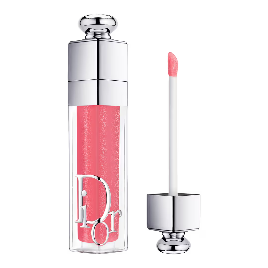 El estuche de este brillo de labios repulpante se adorna con las letras DIOR en relieve plateado, entrelazadas en una tipografía logomanía para una firma estilo joya.